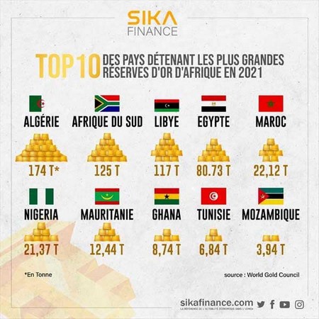 En dehors du top 5, figure à la 6ème place, le Nigéria, 1ère économie du continent, qui se trouve paradoxalement, avec une réserve d'or estimée à 21,37 tonnes en 2021.