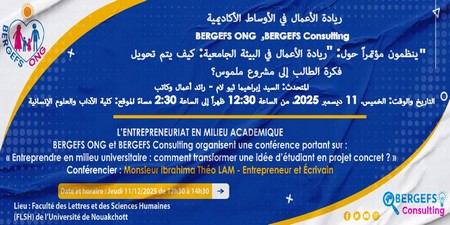 Le jeudi 11 décembre s’est tenu, à la Faculté des Lettres et des Sciences Humaines (FLSH) de l’Université de Nouakchott, une conférence intitulée : « entreprendre en milieu universitaire : comment transformer une idée d’étudiant en un projet concret ? ».